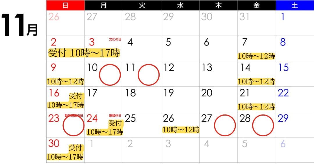 11月の日祝開院日と受付時間