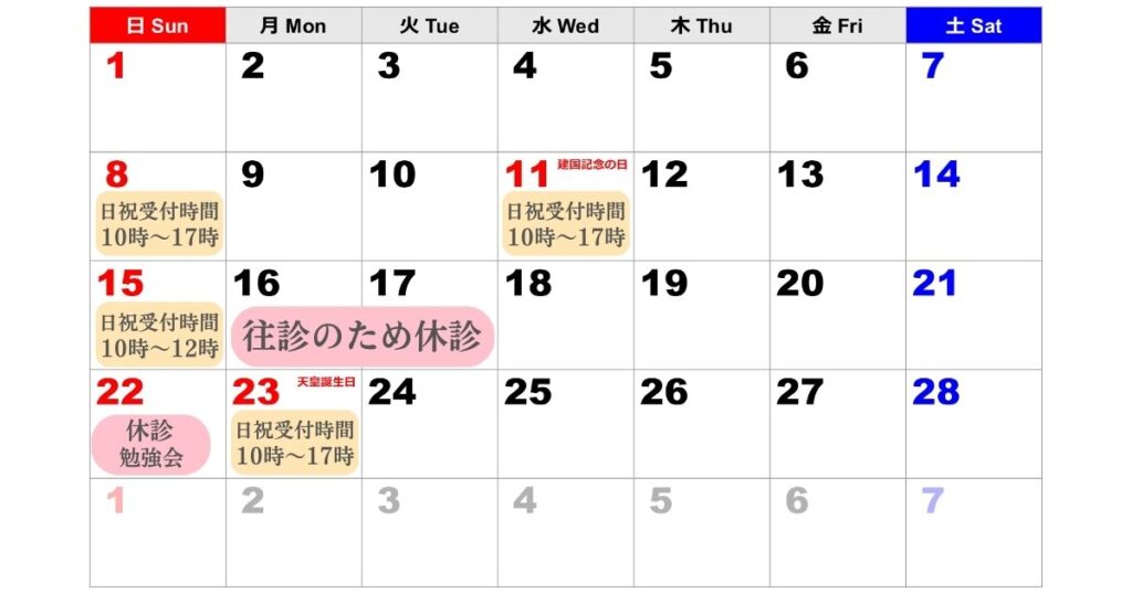 2026年2月日祝開院日・休診日